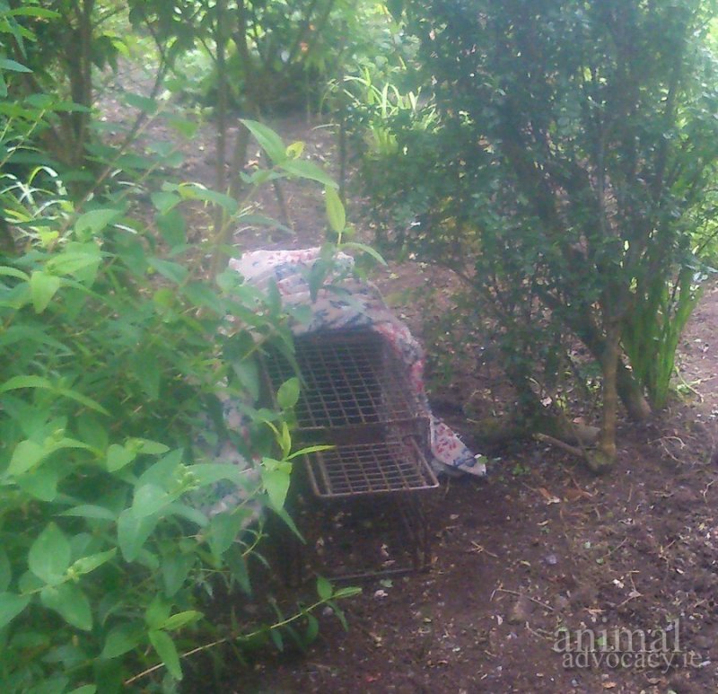 Usually I wouldn’t leave a trap unattended, but I’d them set all over the place, so checked them all regularly. Usually when a cat is trapped they’ll panic, and they can do themselves an injury, trying to get out. So we cover the cage as soon as they’re in there – covered they tend to calm down quickly. Since I had to leave cages unattended, I half covered them, hoping this would give any trapped cats a safe place to sulk. Next time I’ll bring a helper!!!