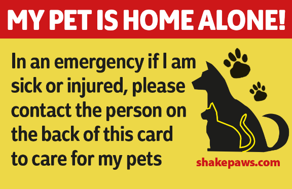 A variety of Pet Home Alone cards and key tags are available online to fill in with care-taker numbers. And it’s easy enough to make one yourself. These are great for carrying on your person or in your wallet.